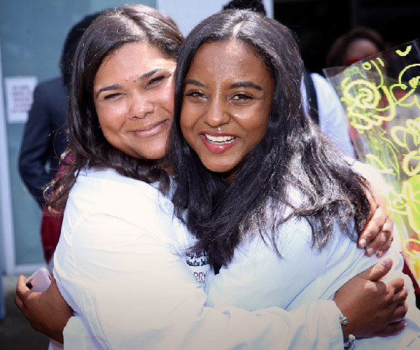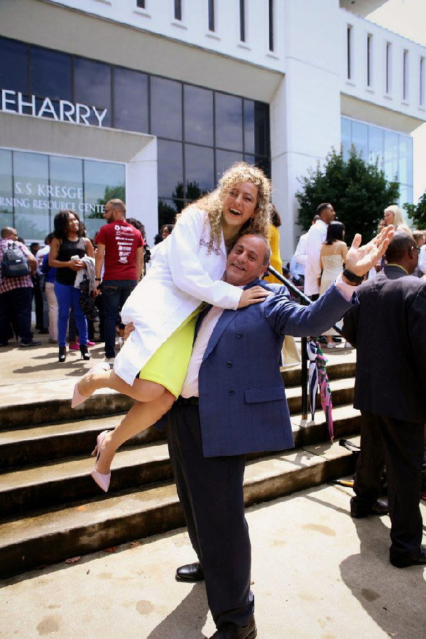 After ceremonies for the School of Dentistry, new dental student Eiriny N. Meshreky gets a lift from her father.