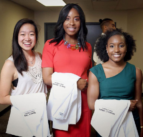 New School of Medicine students (left to right) Rebecca Yang, Erika S. Johnson, and Kenyada I.T. Williams wait to don their new white coats during ceremonies.