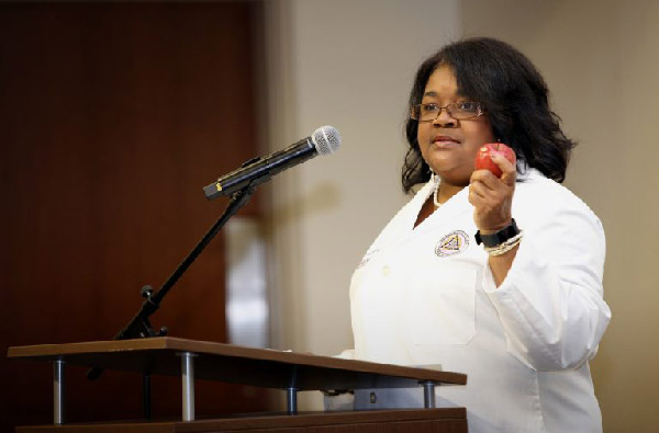 Brenda Lemus, M.D., assistant dean of clinical research, addresses the Class of 2022 during School of Medicine White Coat Day.