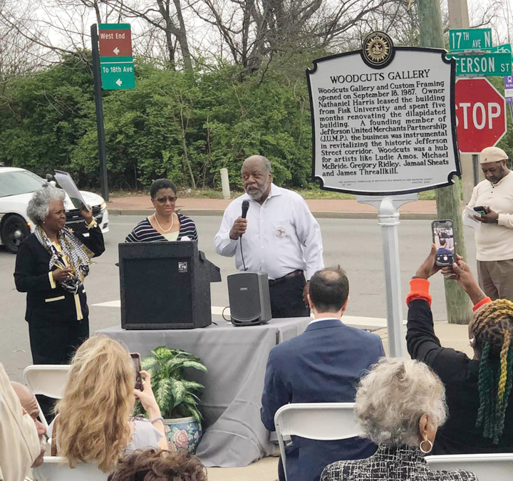 Welcomed to the MHC (Metro Nashville Historical Commission) marker family, number 250 went to Woodcuts Gallery & Framing on historic Jefferson Street in Nashville. On Friday, March 24, the community came together to celebrate Mr. Nathaniel Harris and the entire Woodcuts team as their new historical marker was unveiled. Many thanks are due to those who braved the wind and threat of rain to commemorate this occasion, including Council Member Sharon W. Hurt, Council Member Freddie O’Connell, Vice Mayor Brenda Haywood, and former Mayor Bill Purcell.